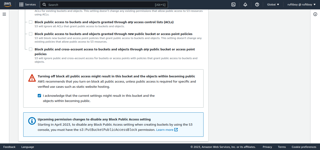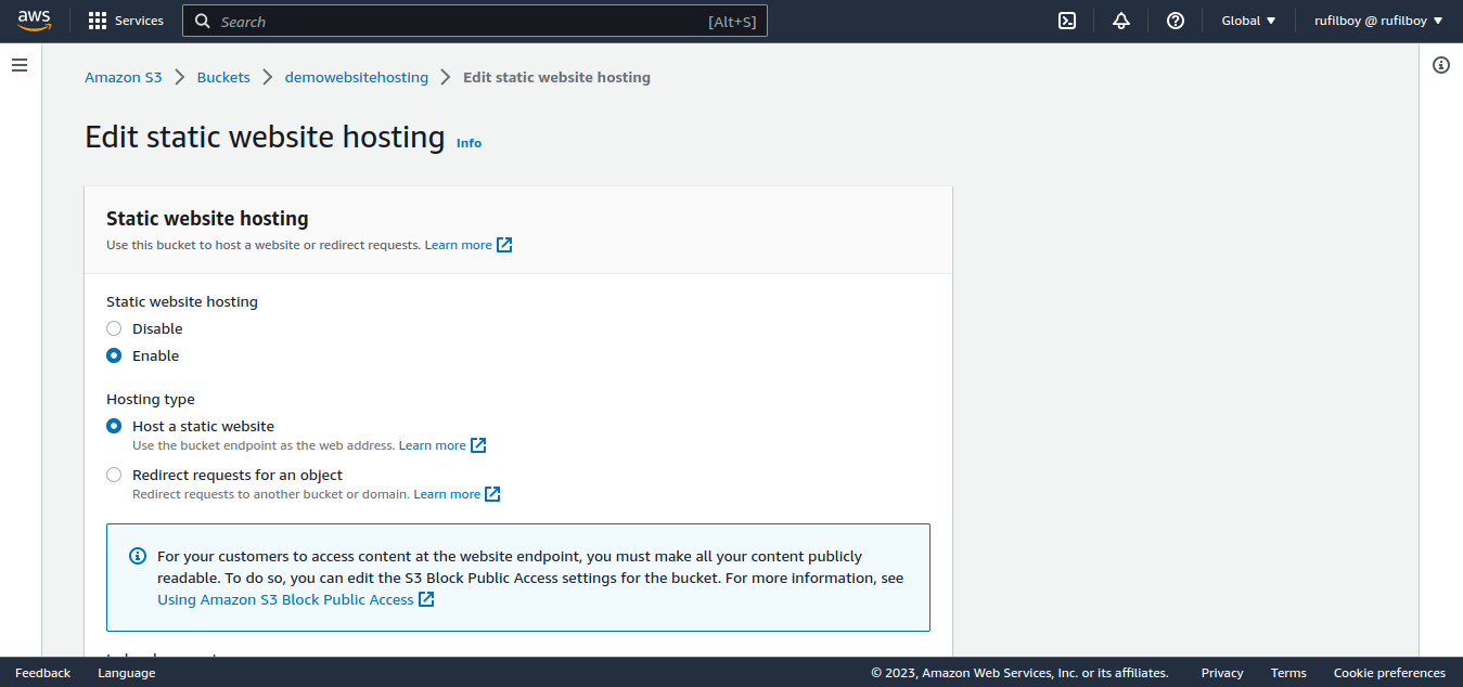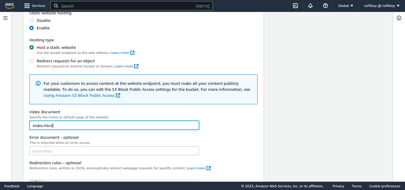 Input index.html in the “Index document”, don’t forget our index.html file is in our bucket root.
