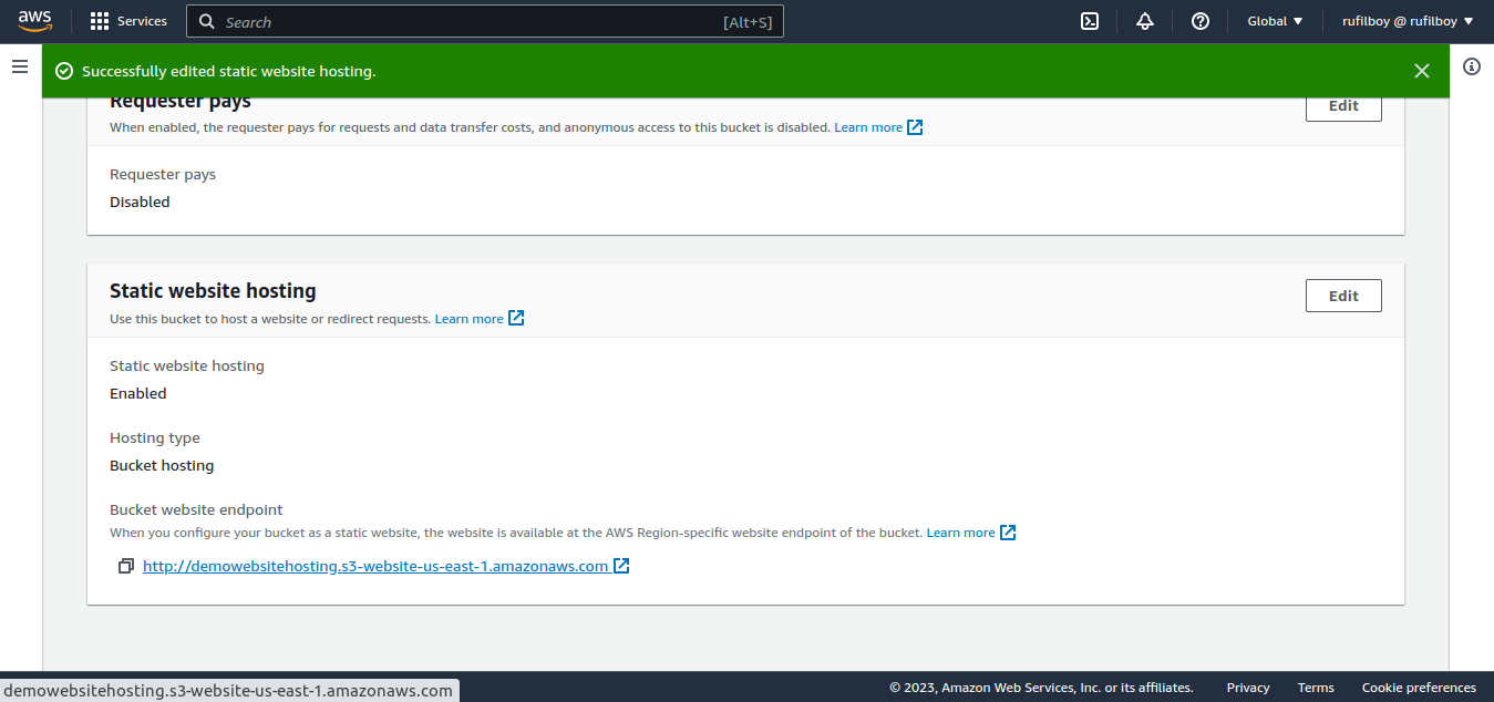 Save changes, and you’ll now see that you’ve been provided with a link! That’s our website endpoint, let’s try to access it from the browser and see if our website is live and accessible.