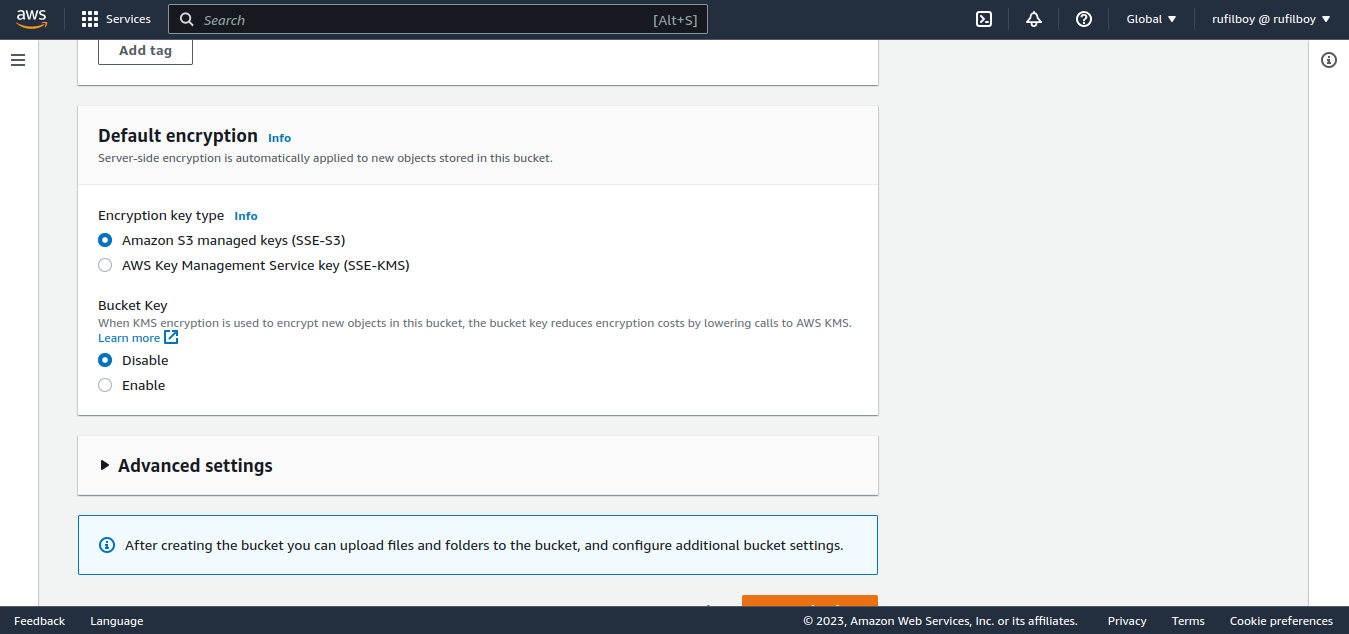 Finally, disable the “Bucket Key”, we’re not using any encryption for our S3 bucket and then click Create bucket.