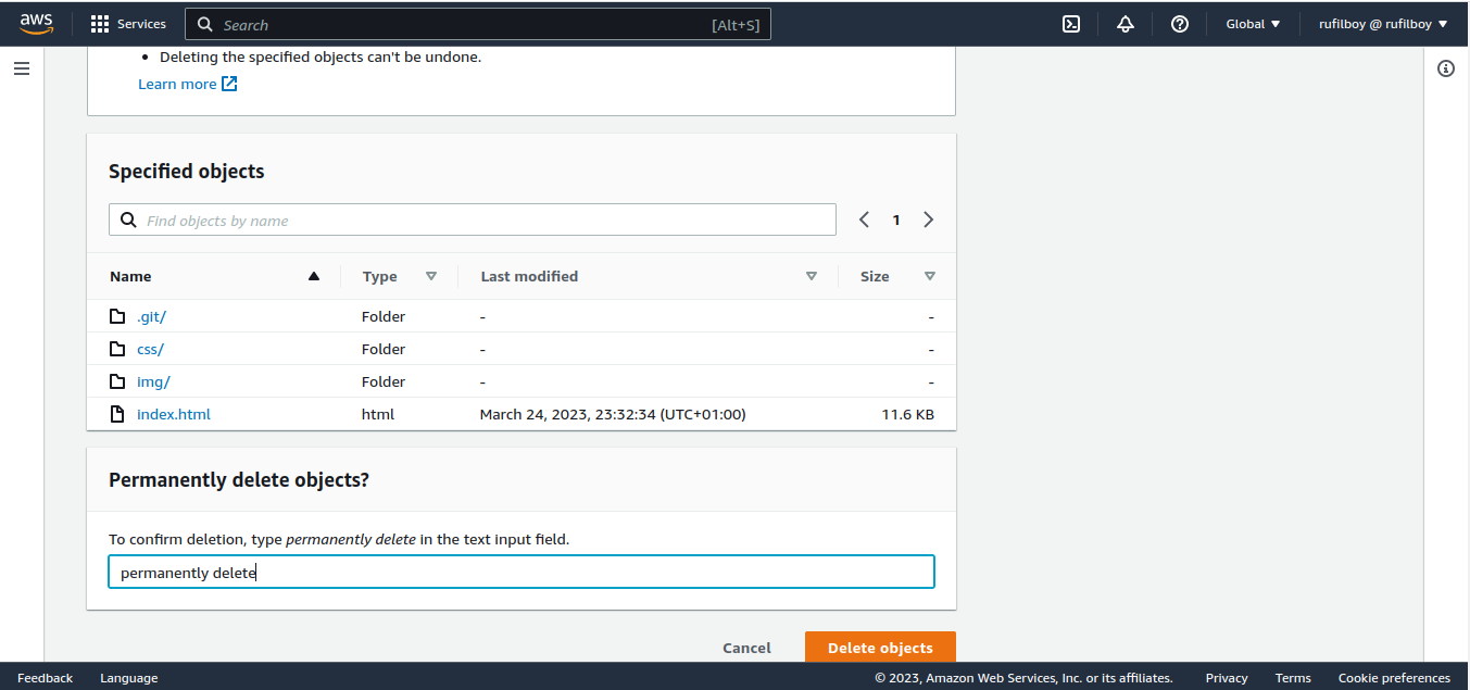 Confirm that you want to delete the objects, AWS will ask you to type “permanently delete”, do so and cont…