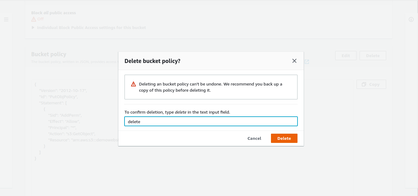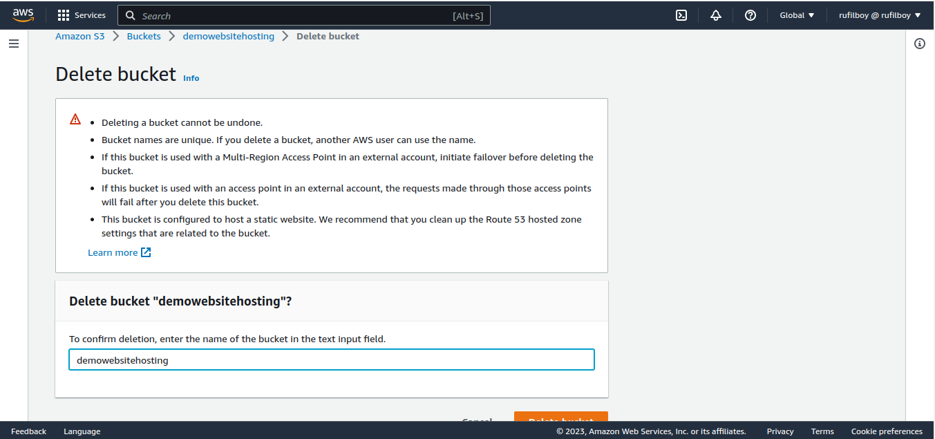 Here you’ll be asked to input the name of the bucket, input the name and delete the bucket!